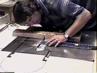 With little concern for shop safety, Mastersmith Fred Gabresek starts to slot the fingerboard like a possessed wookie.